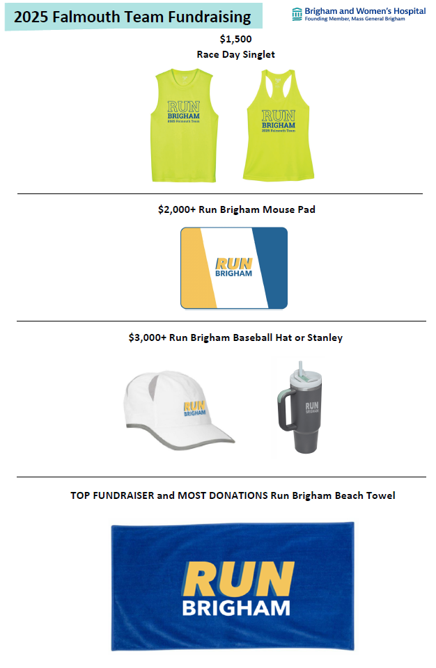 Funds raised by the 2025 Falmouth Road Race Brigham Team will benefit any area of the hospital that is meaningful to you. Please refer to the documents below to help us reach our goal of $125,000!